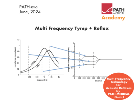 Tympanometry is a key method for assessing middle ear status- measuring the ease of energy flow into the middle ear as air pressure changes.Traditionally using a 226 Hz tone, PATH MEDICAL devices now offer multi-frequency tympanometry with simultaneous presentation of probe tones at frequencies of 226, 678, 800, and 1000 Hz.The acoustic reflex, involving the stapedius and tensor tympani muscles, stiffens the middle ear in response to sound, which can be measured similarly to tympanometry.By using multiple frequencies, PATH MEDICAL's devices aim to improve the detection robustness of acoustic reflexes against artifacts.
