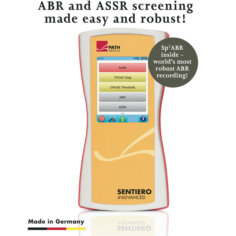 Providing maximum flexibility and unparalleled functionality, the SENTIERO ADVANCED offers ABR, ASSR, EABR, ECochG, OAE, air and bone & speech audiometry AND with the SENTIERO ADVANCED Tymp add-on, Class 1 and 2 Tympanometry, providing test capabilities for your clinic in one device.